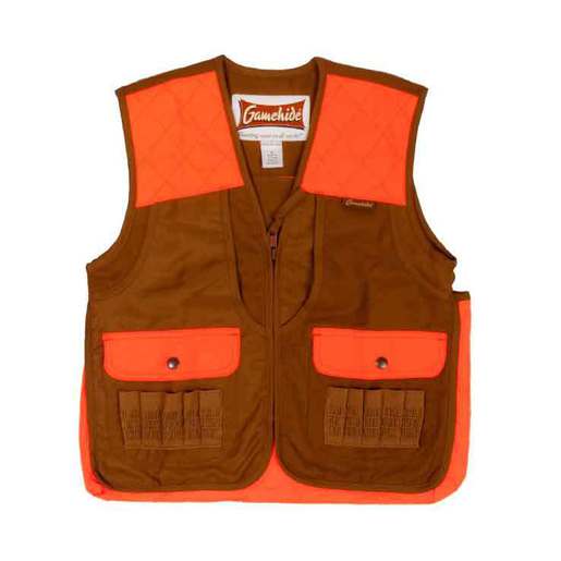 Gamehide Men's Youth Front Loader Upland Vest - Start them out right and keep them visible with this entry level upland vest. Large game bags load from front and rear. Cargo pockets with a snap closure holds lots of shells and gear. Bar tacked pressure points for long lasting use. Large game bags load from front or rearCargo pockets with a snap closure hold lots of shells and gearBar tacked pressure points for long-lasting use