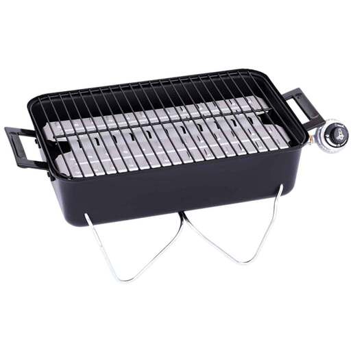 Char-Broil Portable Gas Grill - The Char‑Broil Portable Gas Grill is designed for on-the-go, anywhere grilling. It features 190 square inches of cooking space and durable porcelain coated grates that are rust-resistant and easy-to-clean. This grill has great portability with legs that fold over the top of the grill to lock the lid in place and heat-resistant handles for easy pickup-and-go. COOKING SYSTEM: With the power of liquid propane this Portable Gas Grill is convenient and versatile GRATES: Durable porcelain coated grates for rust-resistance and easy-to-clean convenience SIZE: 190 square inches of cooking space DURABLE: Steel construction and a durable, high-temperature finish help prevent rust to extend the life of the grill Firebox size (-Inches): 17.13in x 11.06in Cooking surface: 6 Hamburgers or 8 Chicken Thighs or 9 Pork Sausages Liquid Propane Fuel Type: 1lb cylinder Ignition Type: Piezo Cooking Grate Material: Porcelain-coated steel Temperature Gauge: No WARRANTY: 90 Days Burner, Grate, Lid and Other Parts
