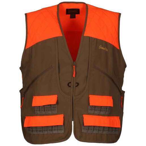 Gamehide Men's Pheasant Hunting Vest - The standard in pheasant country and a Gamehide best seller for over 20 years! This classic looking vest will last many years and will bring back memories every time you pull it out of the closet. Blaze orange on the shoulders and back of game bag for added safety The large zip storage pouches will hold a ton of shells and include external covered shell loops Quilted shoulder patches for left or right handed shooters soften the recoil of your shotgun Front and rear loading blood-proof game bags are features Style: 3A0