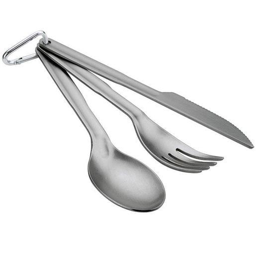 GSI Outdoors Halulite 3 Piece Ring Cutlery Set -Halulite says goodbye to scratches, burn circles and ounces. As light as Titanium, Halulite is a proprietary alloy that also conducts heat better and more evenly, so you can leave the extra fuel at home. Plus, every piece is Hard Anodized to create a surface that withstands scratches and abrasions like nothing else. It's ultra light without the sacrifices. Now that's smart. Weight: 1.6 ozDimensions: 7.20" x 1.60" x 0.80"Material: Proprietary, Ultralight Alloy