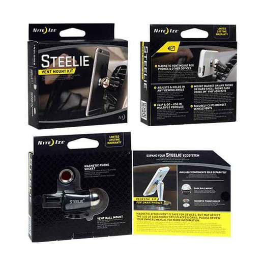 Nite Ize Steelie Phone Vent Mount Kit - The Steelie Vent Mount Kit is a brilliant solution for keeping your smartphone secure and visible when you're in the car - any car. It consists of two simple components: 1) a Steelie Magnetic Phone Socket that adheres semi-permanently with 3M® VHB™ foam tape, either to the back of your case or to the phone itself, and 2) a versatile Steelie Vent Ball Mount that securely clips to most vehicle vents, and is just as easy to unclip, so it can be used in multiple vehicles. The Vent Ball's round shape allows radiant positioning options, so you can tilt your phone to any angle, and the strong magnetic attachment of the Steelie Phone Magnet Socket keeps your phone securely in place and where you need it. Dimensions: 1.2in x 1.0in x 2.5in 31.1mm x 25.1mm x 63.5mmWeight: 1.9oz 53.9g3M VHB foam adhesive can be removed without damage to surfacesThe Magnetic Phone Socket features 3M VHB foam adhesive for secure attachmentAdjusts and holds in any viewing angleClip and Go Steelie Vent Mount features an easy-to-use universal clip that attaches and detaches from nearly any vehicle vent