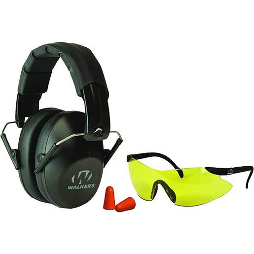 Walker's Pro Low Profile Eye and Ear Protection Kit -The ultra-light Walkers PRO - Low Profile Folding Muffs provide complete protection with outstanding comfort whether in the field or at a shooting range. To ensure comfort, these muffs feature low profile contoured cup, a padded headband and soft PVC ear pads all in a compact folding design. With a noise reducing rating (NRR) of 31db, the PRO - Low Profile Folding Muffs help protect your hearing from sustained or loud sounds. The Sports Glasses feature High grade Polycarbonate lenses which exceeds ANSI 287.1-2003 High Impact Requirement and offer UV - Ultimate Vision. The design allows air to flow freely and adjustable nose pad for comfortable fit. Walker's Foam Ear Plugs are noise reducing rating, NRR 31dB which are ideal for loud environment and conforms to shape of you ear. Muff: Low profile contoured cup and Padded headband for comfortable fit Soft PVC ear pads, Ultra-light weight and Compact folding design Sport Glasses: High grade Polycarbonate lenses and Exceeds ANSI 287.1-2003 High Impact Requirement Sport Glasses: Design allows air to flow freely with adjustable nose pad Foam ear plugs: conform to shape of ear providing NRR 31 db.