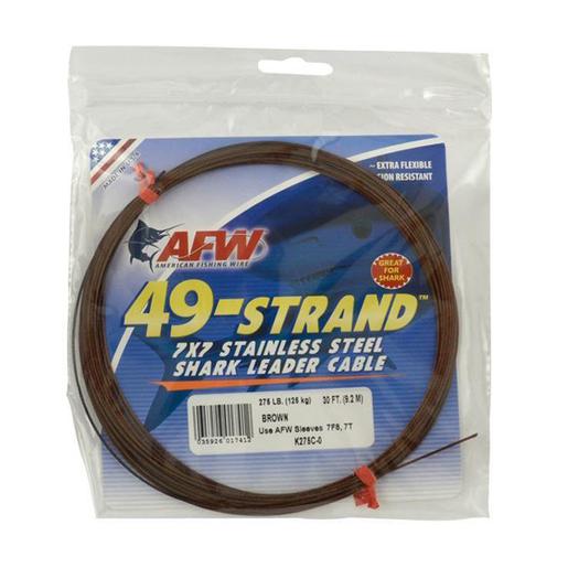 American Fishing Wire 49 Stainless Steel Shark Leader Cable - American Fishing Wire 49 Stainless Steel Shark Leader Cableis made from high strength, corrosion resistant Type 304 stainless steel, 49-Strand 7x7 cable provides excellent kink resistance and bite protection against Shark and other big game toothy fish. Oftentimes when a Shark strikes a bait, they twirl violently. This motion can kink single strand leader wire and can be more destructive to your tackle than the fierce bite. The American Fishing Wire 49 Strand Stainless resists kinking, wrestles back, and allows you to hook up and haul in. Resists kinking7x7 cableMPN: K