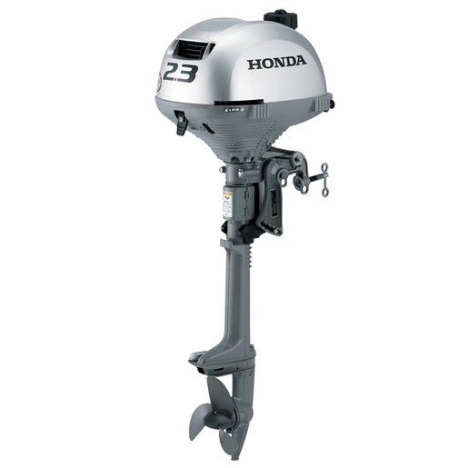 The best way to think about the Honda Portable Outboard 2.3HP boat gas motor is big power in a small package. When it comes to portable light-weight power, it doesn't get any better than the Honda Portable Outboard 2.3HP gas-powered four-stroke outboard. The Honda 2.3HP is so light, and so powerful, that is beats out similar two-stroke 2HP electric motors. In fact, the Honda 2.3HP outboard has about 15 percent more power than most similiar motors in its class. With an internal gas tank that is about 12% larger than its predecessor, the Honda 2.3HP can operate for an hour at full throttle. The Honda Portable 2.3HP outboard weighs less than 30 pounds and has a front mounted carrying handle making it extremely easy to transport, carry and install. It's ideal for zodiacs, dinghys, jon boats, and other small water craft including kayaks. If you need to travel compact, and want to have a boat motor that's easy to transport, it really doesn't get any more convenient than the Honda BF2.3 outboard. Unlike other gas powered outboards, the BF2.3 is quiet and smooth. It's almost like having an electric motor but without the battery. Best of all, you maintain the power of a gas engine. On a small tender you can expect the Honda 2.3 HP to get you to top speed of 5-11 mph. On a small Honwave T20ESE (6.5') the BF2.3 is able to reach a top speed of 10.4 mph. Alan Simmons, national manager at Honda Marine, aptly characterizes the BF2.3 as a "powerful, dependable and fuel-efficient giant." It truly provides enhanced performance for an all around better boating experience. For the avid angler, the new BF2.3 offers one very exciting benefit—the ability to run in the shallows. A shorter shaft, and lack of a water pump, eliminates tangling and clogging from weeds and sand, whereby allowing you to get in close to where the fish are holding. Features and benefits: 15% more horsepower than the BF2 360 degree swivel steering for enhanced menueverability Fold down tiller for easy stowing and transport Adjustable trim with 4 settings for maximimum performance .27 gallon internal tank (1 hour run time) 3 Blade plastic propeller 5 year transferable, non-declining warranty Forced air cooled engine (no water pump) Improved corrosion protection Displacement 57.2cc Type: 4 stroke OHV, 1 cylinder. 2 valves