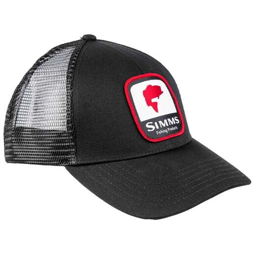 Simms Bass Patch Trucker Hat - This classic trucker cap has a Simms Bass Logo patch on front. Mesh backing for breathability Pre-curved brim 57% Polyester/43% Cotton Style: 12212