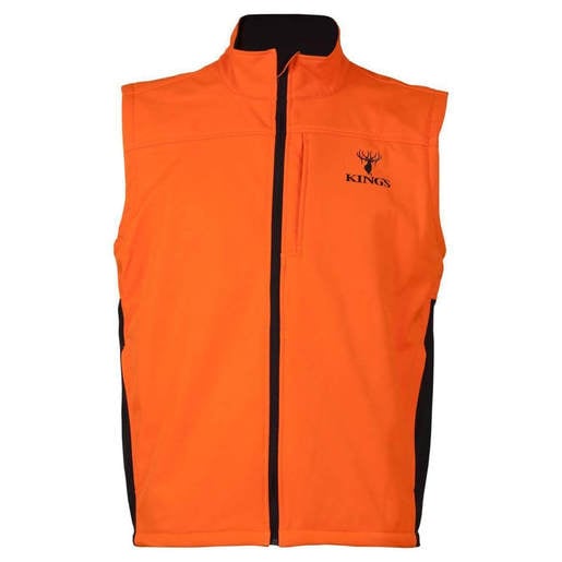 Kings Camo Men's Softshell Hunting Vest - The Blaze Orange Soft Shell Vest has more features than a traditional blaze hunting vest. Battle the elements and provide safety during hunts. Blaze soft shell fabric Windproof and water resistant Black stretch fleece side panels Fleece collar Chest pocket Two side hand pockets Extended back coverage Weight: 17oz Style: KBZ425