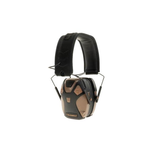 Caldwell E-Max Pro Electronic Hearing Protection - FDE - The E-Max Pro high quality electronic hearing protection from Caldwell delivers style and comfort for all day use. With a 23dB Noise Reduction Rating (NRR) and a low-profile design, you can stay comfortable and protect your hearing on the range. High quality stereo sound keeps what you want to hear crystal clear and easy to use push button volume controls make for easy adjustments. Runs on 3 AAA batteries, which are included, and is compatible with Caldwell's Rechargeable Lithium-Ion Battery Pack (sold separately) Auto-Shutoff After 4 Hours Without Touching Controls Low-Profile Design For Uninterrupted Cheek Weld Dual Microphones For Directional Clarity 23dB NRR High Quality Stereo Sound Illuminated On/Off Indicator Includes 3 AAA Batteries Compact Folding Design