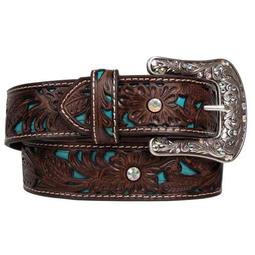 Ariat Women's Tooled Overlay Leather Belt - Perfect for any pair of jeans this belt is the perfect blend of country simplicity and stylish bling. Detachable Rhinestone silver buckle Turquoise inlay with an elegant design 1.5in width Single keeper Style: A1513402