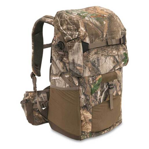 ALPS Outdoorz Impulse 30 Liter Hunting Day Pack - Realtree Edge - Tree stand and blind hunters will appreciate the unique features offered by the Impulse Hunting Pack by ALPS OutdoorZ®. Featuring all-new DEADQUIET fabric, the Impulse keeps every movement quiet when reaching for your favorite deer call, or that extra layer on a crisp fall day. DEADQUIET is a unique construction consisting of a fleece exterior, a suede-fabric interior, and a membrane sandwiched in-between that keeps out moisture. A flat bottom, plus rigid structure allows the pack to stand up independently, making it ideal for ground blind or tree stand hunting. You'll appreciate the zipper-less design when accessing gear in the main compartment. Instead of a noisy zipper, a series of magnets and hooks allowing hunters to access items quietly and easily. Other hunter-friendly features include multiple interior mesh pockets for organizing gear, an ambidextrous quiver holder, 2 deep side pockets, a drop-down gun/bow pocket, and a hydration pocket with 2 side ports. DEADQUIET fleece exterior let's you hunt silently without spooking game Interior suede lining fabric keeps extra quiet when reaching for items while on stand Waterproof membrane for added weather protection Zipperless lid design for quick, quiet access to main compartment Lid secures closed via magnets and aluminum hooks Multiple interior mesh pockets for organizing gear Rigid Pack structure stands up on its own, making it great for hunting out of a blind or stand Quiver holder uses a unique bungee and cordlock design on both sides of the pack 2 side and 1 front mesh pocket for extra gear Drop-down pocket for secure carry of your gun or bow 2-piece adjustable, removable waistbelt 2 sleek, easy access waistbelt pockets Hydration pocket with 2 side-outlet hydration ports (reservoir not included) Included rain cover for extra water protection Perfect for hunting from a blind or tree stand Freestanding bucket-style top loader DEADQUIET fabric with fleece exterior and suede interior Membrane sandwiched in-between that keeps out moisture Main Compartment Dimensions: 23"h. x 12"w. x 8.5"d. 30L (1,850-cu. in.) carry capacity 4 lbs. 14 oz.