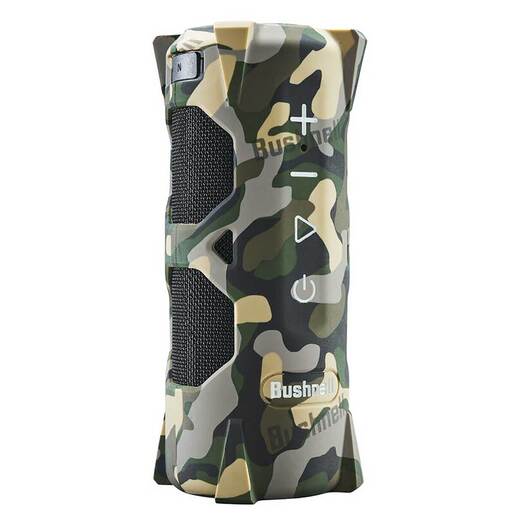 Bushnell Outdoorsman Bluetooth Speaker - Camo/Black - Being in the great outdoors usually means leaving sensitive electronics behind, but not when you have the Bushnell Outdoorsman Bluetooth Speaker! It’s drop-proof, rain-proof, wireless, and can even charge your cell phone and other smart devices. There’s nothing like your favorite tunes to set the mood for a tailgate party, evening barbecue, or a gathering by the campfire, and the Bushnell Outdoorsman Bluetooth Speaker delivers the music you love, anytime, anywhere, and with premium sound quality no matter the weather. Rugged construction means this speaker doesn’t miss a beat—literally! It’s drop-proof on concrete up to six feet, and you get two rubber EXO Armor slip-on sleeves for extra protection. Rain-proof design means this speaker works even when the weather’s not cooperating. Terrific sound quality won’t fade fast thanks to a generous 10-hour battery life that recharges to full power in as little as three hours. True Wireless Stereo Mode! Buy two Outdoorsman and link them together for genuine stereo listening pleasure. Mount the Outdoorsman out of harm’s way thanks to the BITE Magnet on the rear of the speaker; with the BITE Strap that works on non-steel/iron surfaces, or the built-in D-ring loop via the 1/4-20 mount. Speaker works as a portable charger for cell phones and other smart devices via the output USB port. Black and Camo rubber EXO Armor included SPECS Speaker: ColorCamo / Black Output Power: 10 W USB Output Power: 2.1A Battery: 5200 Mah 7.2V Play Time: 10 Hours Charge Time: 3 Hours Charge Port: Micro USB Height (in.): 7.62" Weight (g): 723 g Waterproof Rating: IPX6 Max SPL (1M Distance): (Avg. 20 Hz to 20 KHz) = 85dB Attachment Point: 1/4-20 Thread (includes D-Ring Loop)
