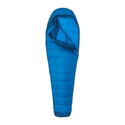 Marmot Trestles Elite Eco 20F Degree Long Mummy Sleeping Bag - Estate Blue/Classic Blue - Sustainable design that doesn't sacrifice performance in cold weather around 20F. The PFC-free, mummy-style Trestles Elite Eco 20 Sleeping Bag - Long fill is made from 96% recycled material and has the lightweight, easy compressibility of the original. HL-ElixR Eco synthetic insulation uses a unique blend of three fibers for maximum warmth, soft handfeel, and high loft. Wave and blanket construction plus a roomy footbox provide optimal warmth and comfort. A fold-down secondary zipper offers ventilation and easy access. Features Fold-Down Second Zipper Provides added Ventilation and Easy Access, Main Zipper Anti-Snag Slider reduces Snagging Anatomically 3D Footbox increases the insulation and room for your feet, for more Warmth and Comfort HL-ElixR ECO Unique Blend of 100% Recycled Fibers Provides Maximum Warmth, Soft Feel and High Loft EN Tested Combination Wave Construction Top provides Maximum Loft and Warmth, Blanket Construction Bottom for the best warmth and comfort under body 3D Hood Construction External Stash Pocket Snagless Insulated Draft Tube Two Hang Loops Compression Stuff Sack Storage Bag