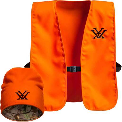 Vortex Blaze Orange Vest And Beanie Combo - Safety orange for the field. Vest is lightweight and has a snap clip front Safety orange beanie with Realtree camo pattern inside Vortex logo on center front of beanie and left chest of vest Style: 221-34