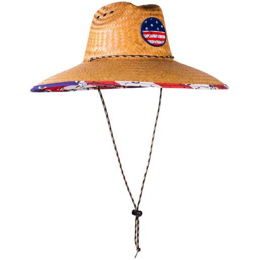 Peter Grimm Americana Straw Sun Hat - Designed for all day comfort and keeping the sun off of you in style. Sun hat style Waterproof Red, white, and blue patch on front with colored underbrim to prevent glare Drawstring chin strap Created using straw Style: PGB1838