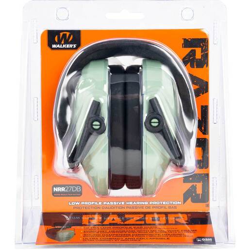 Walker's Razor Slim Passive Earmuffs - Sage Green - The Walker's Razor ear muff provides an excellent balance of quality, value, and safety. Made of a durable sound dampening composite housing with a rubberized coating, the Razor provides a noise reduction rating of 27 NRR at a very affordable price. The headband allows you to wear the Razor during long range sessions in comfort. The low-profile ear cups are ideal when shooting longs guns because they are less likely to interfere with the stock. An over-the-ear muff is preferable for indoor ranges as well. Protecting your hearing is very important so Walker's makes protecting your hearing easy.