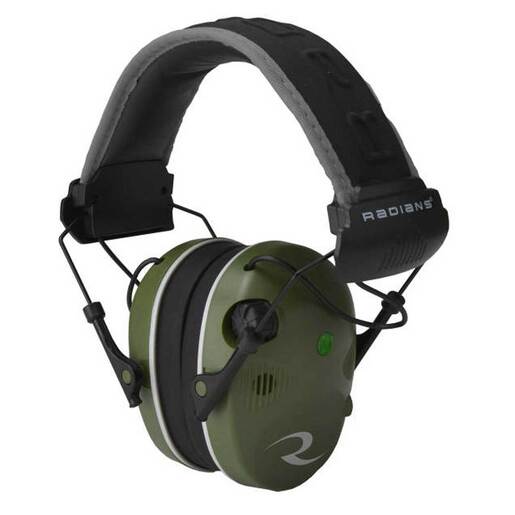 Radians R-3400 Quad Mic Electronic Earmuff - Military Green - Radians R-3400 Quad Mic is an electronic sound amplification earmuff. Four independent microphones provide a full surround sound experience that amplifies low sound level noises while compressing sounds that exceed safe levels. Compact folding feature for easy storage. 3.5mm stereo input jack and patch cable works with most smart devices Electronic compression to protect hearing Amplifies environmental sounds for enhanced hearing Four microphones LED On / Off indicator light Adjustable headband folds for compact storage 3.5mm stereo input jack and patch cable enable playback from smartphone or digital audio player NRR 24 dB (2) two AAA batteries required