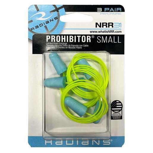 Radians Prohibitor Small Corded Disposable Foam Earplug - 3 Pack - The Radians FP75 Prohibitor Small Corded Disposable Foam Earplugs are sized to comfortably fit smaller ear canals while offering NRR 31dB protection. Tested according to ANSI specs S3.19-1974, Radians Made in the USA disposable foam earplugs feature soft, slow-recovery foam for extreme comfort and outstanding noise reduction to protect hearing. They are easy to roll down and insert, and they expand slowly for a low-pressure fit. Ideal size for smaller ear canals NRR 31db Polyurethane Foam Tapered Bullet Shape Soft, slow recovery foam Made in USA Meets ANSI S3.19 12% smaller than standard plug