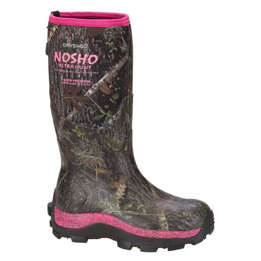 Dryshod Women's NOSHO Ultra Cold Conditions 5mm Insulated Waterproof Hunting Boots - Camo Extreme Cold-Conditions Hunting Boot. Extreme warmth for the extreme hunter with a women’s cut for superior fit and function. DS1 molded outsole – outer and inner grip 6 layers of protection plus EVA cold-blocking midsole = 7 layers 5.5mm bootie 2.5mm DENSOPRENE XD foam (extreme density) for extra protection 2mm airmesh 2mm warm fleece lining = 11 mm of insulating warmth and protection! Removable molded EVA sockliner Double achilles heel and instep reinforcement for comfort and protection Nylon shank 100% Waterproof Style: MBM-WH