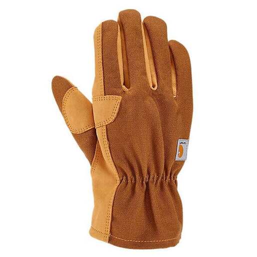 Carhartt Women's Duck/Synthetic Leather Open Cuff Gloves - These women's gloves provide warmth and coverage at home or on the job. Cotton-duck shell Synthetic leather palm and palm patch Elastic wrist for a snug entry Reinforced palm and thumb saddle for durability Style: GW0793