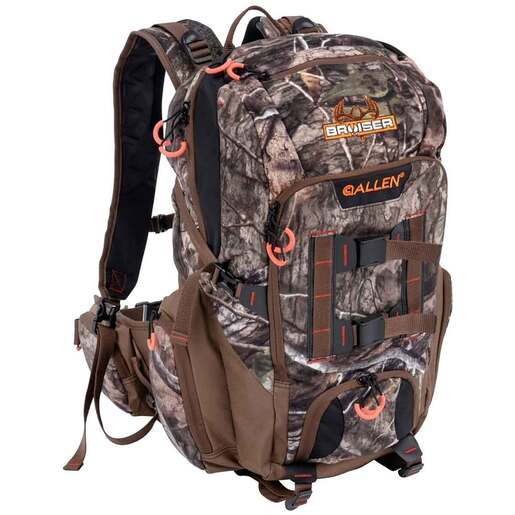 Allen Gear Fit Pursuit Bruiser Whitetail 39 Liter Hunting Daypack - The Bruiser Whitetail Daypack By Allen has 2350 cubic inches of storage capacity in a backpack designed specifically for whitetail hunters. Constructed from quiet Mossy Oak Break-Up Country camo fabric, this pack features a fold-down workstation that gives you easy access to your gear when you're in the treestand. The workstation remains open to keep your hands free, and it has two pouches with stretch closures, perfect for holding calls, a removable patch with elastic loops that can hold just about anything from scent to range finders, plus a mesh zippered pocket for your keys and phone. The main compartment of the pack has a wide opening so you can quickly get at large items, and it also has a slot to hold your favorite hydration pouch. The outside of the pack has two large zippered pockets, a small accessory pocket, plus slots for rattling antlers. On the front of the pack, there is an adjustable gun or bow carry system that tucks away neatly inside another pocket when not in use, and on the bottom of the pack, there's a hidden pouch for the included reversible rain fly. When you need it, simply unzip and pull it out to cover your pack in seconds. The comfortable and breathable shoulder straps are molded and padded to allow air to flow, and air mesh sections keep critical areas dry. Two large pockets are conveniently placed on the padded waist belt to allow quick access to essential items. Features Pack dimensions: 14 inches x 21 inches x 8 inches 2350 Cubic -Inches Constructed From quiet Mossy Oak Break-Up Country Camo Fabric Fold Down Workstation Two Pouches with Stretch Closures Plus a Mesh Zippered Pocket for Your Keys and Phone