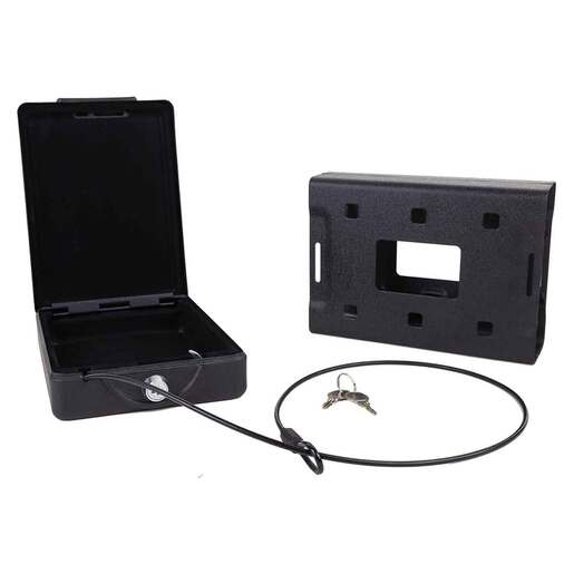Bulldog Personal Car Vault Key Lock Pistol Safe - The Bulldog Car Vault is perfect for storing your handgun on the go. The Car Vault mounting bracket can be installed in your car truck boat home or office. When the Car Vault is locked it cannot be removed from the mounting bracket. A security cable is supplied to secure the vault when not locked into the mounting bracket. The heavy-duty steel construction will provide protection and the soft interior is durable and scratch-resistant. Battery type: AA Matte black powder coat finish Key entry Mounting hardware / bracket / security cable Scratch resistant interior Interior Dimensions: 7in x 5.25in x 2in Exterior Dimensions: 8.70in x 6in x 2.50in