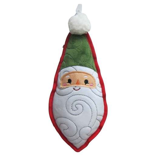 ROCT Outdoor Santa Toss Plush Dog Toy - The perfect toy for the family dog's Christmas stocking. Shape ensures easy toss in game of fetch. 11.5in x 5in x 2in 3mm inner lining Overstitching binding on seams Squeaker White minky Fabric Grean and White micro fiber with embroidery