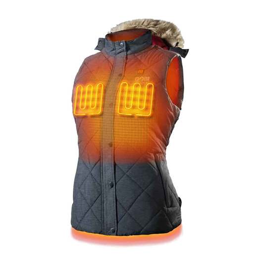 Gobi Heat Women's Cirrus Heated Vest - The quality starts from the outside in, featuring a quilted melange outer shell. This vest features a removable faux fur hood. The Cirrus vest provides you with a fully flexible hood option that you can use in wet environments or remove for a warmer day. Each Cirrus Heated Vest is equipped with Gobi Heat’s premier conductive thread heat system, providing customizable warmth to all areas of your body. The efficient battery heated vest is sure to keep you warm and looking great this winter. Choose your temperature at the click of a button: LowithMedium/High 3-zone heating - 2 in the chest and large zone in the back Up to 10hrs battery life (on lowest heat setting) Switch out an extra battery with ease for longer use with removable battery Machine washable Water resistant - moisture wicking means water beads right off Battery and charger included - battery has LED Life Indactor lights and USB port for mobile charging Style: CI