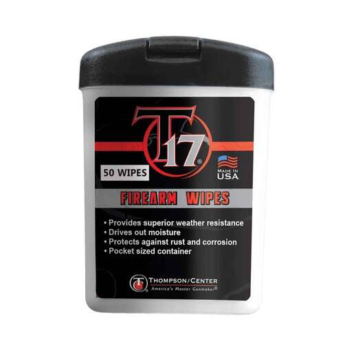 Thompson T17 Firearm Wipes - A handy wipe that coats your firearm with a micro thin layer of protectant that withstand the corrosive effects of black powder fouling. Use these wipes prior to hunting in foul weather. Keeps your firearm in factory condition.