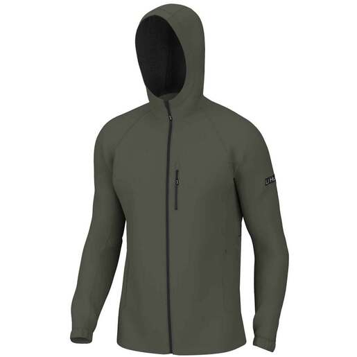 Huk Men's Rover Lightweight Waterproof Fishing Jacket - This jacket will keep anglers warm, dry, and ready to conquer any fishing expedition; it's designed to provide anglers with optimal protection in adverse weather conditions. 2.5L waterproof body fabric guarantees superior water resistance Fully seam-sealed construction Adjustable bungee hood ensures a snug fit Zippered chest pocket Zippered hand pockets Roll up the jacket and conveniently store it in its own zippered chest pocket 95% polyester and 5% spandex Style: H4000148