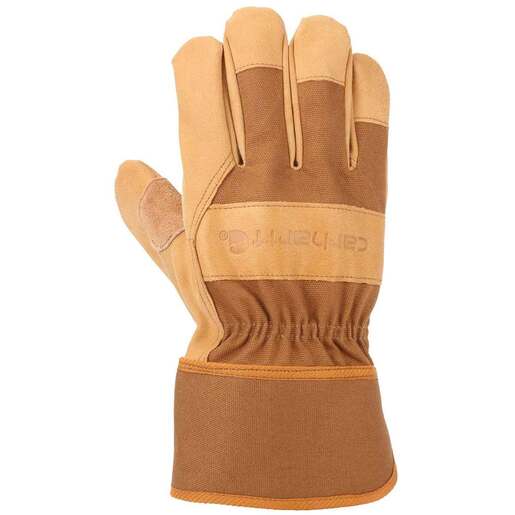 Carhartt Men's Grain Leather Safety Cuff Work Gloves - Stacking wood or clearing brush, hard-working hands deserve the durability of System 5 synthetic leather. These men's work gloves are made of sturdy cotton duck with a System 5 synthetic leather palm, reinforced suede cowhide patches, and knuckle protection. 100% acrylic, stretchable rib-knit fabric Carhartt Detroit label sewn on front System 5 synthetic leather Reinforced suede cowhide patches Style: GW0518M