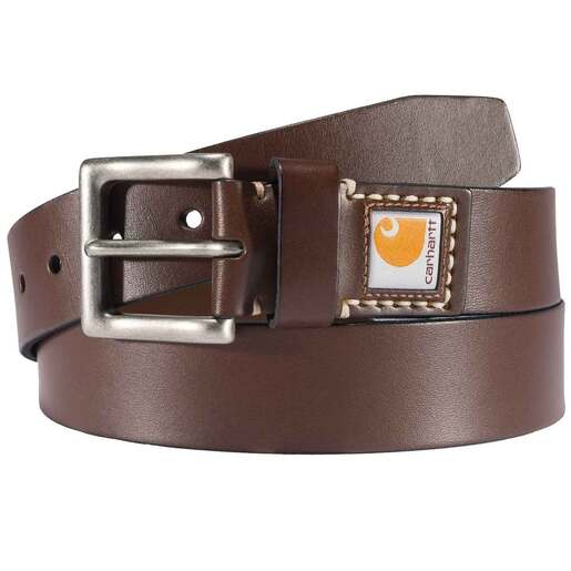 Carhartt Men's Saddle Leather Belt - This belt has a clean and classic design that wears well anywhere. It's made of durable full-grain leather with a square harness buckle. A woven Carhartt label is stitched into the belt next to the tab. Full-grain leather Harness buckle Nickel Roller Finish Width: 1.5in Style: A0005502