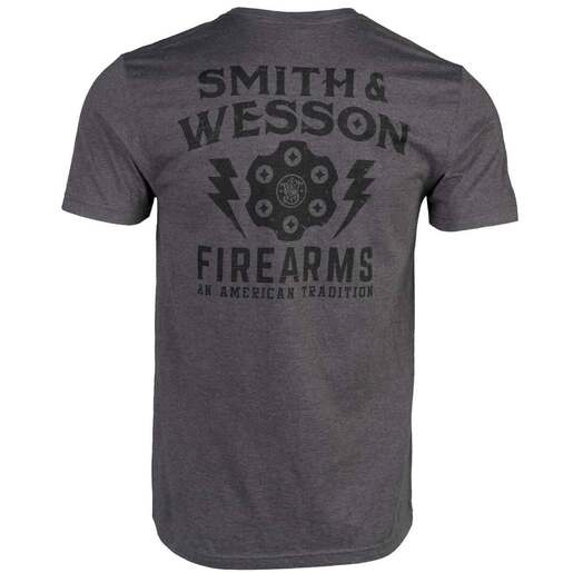 Smith & Wesson Men's Lightning Bolts Short-Sleeve Casual Shirt - Designed for all-day comfort, this shirt is perfect on or off the range. Printed graphic on the back Small Smith & Wesson logo on the front Crew cut 65% polyester/35% ringspun cotton Style: A2237