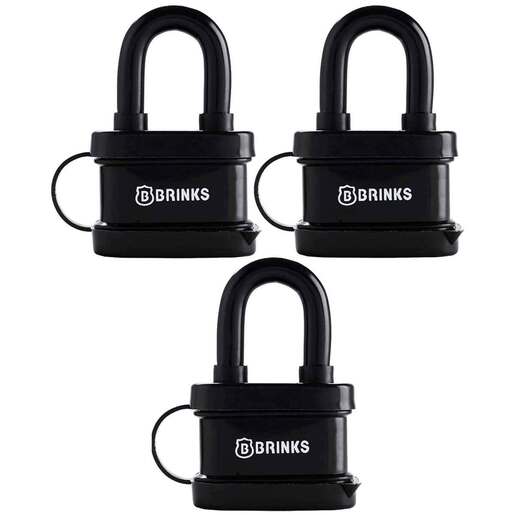 Brinks 40mm Laminated Steel Weather Resistant Padlock - 3 Pack - Brink’s Weather Resistant Padlock features a laminated steel 40 mm body with a chrome plated, hardened steel shackle wrapped in vinyl for increased cut resistance. The padlock is equipped with brass 4-pin tumbler, dual lever locking mechanism for pick and pry resistance and a key cylinder cover to keep dirt and grime out for long lasting performance. The padlock can be use indoors or outdoors. With its superior corrosion resistance, it is perfect for use in any wet climate and the harshest environments. The padlock is ideal to use to secure doors, gates, sheds, trailers, storages, chains and other items subjected to the elements. Features The entire lock is vinyl wrapped for use in wet climate and/or harsh environments. Strength - Steel shackle has a cut Strength up to 2317 lbs. Quality You Can Trust - A global leader in Security-related products and services, the Brink's name is synonymous with top quality products to keep you and your belongings safe.