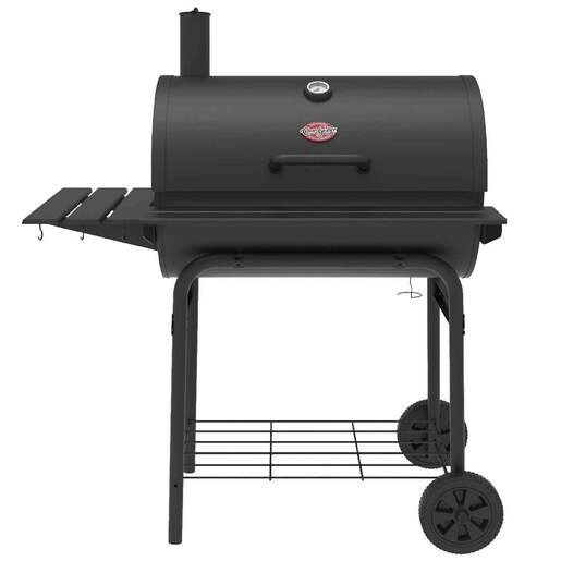 Char-Griller Pro Deluxe Barrel Charcoal Grill - Get everything you need for the ultimate outdoor cooking experience with the Char-Griller Pro Deluxe Charcoal Grill. This charcoal grill provides all the features you need for a seamless outdoor grilling and smoking experience, and even has the ability to attach a Side Fire Box for supreme charcoal smoking methods to achieve delicious food texture and flavor. Fire up the grill for any night of the week with the Pro Deluxe Charcoal Grill. Features Durable charcoal barrel grill with 850 square inches of total cooking space Heavy duty steel construction to ensure your charcoal grill lasts for years to come Insulated grill body to maintain smoke and heat for fuel efficiency and supreme food flavor and texture Dual damper controls to provide precise airflow control to achieve perfectly cooked foods EasyDump Ash Pan to easily dispose of your ashes and continue grilling with ease Includes cast iron cooking grates to lock in food flavor Chrome-plated steel warming rack to keep food warm Side shelf for additional food preparation space Fashioned with wheels for easy mobility Includes one grill grate lifter Side Fire Box compatible to transform your grill into a Texas-style offset smoker for outstanding food flavor and texture (Side Fire Box sold separately)