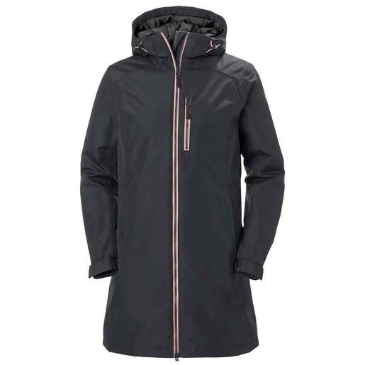 Helly Hansen Women's Belfast Long Winter Jacket - This best-selling women’s insulated raincoat withstands cold downpours and looks amazing doing so. 100% polyester shell 100% polyamide lining 100% polyester insulated body and sleeves HELLY TECH protection Waterproof, windproof and breathable 2-ply fabric construction Fully seam sealed Durable Water Repellency treatment Primaloft black 60gr insulation in the sleeves Primaloft black 100gr insulation in the body Quick dry lining Fixed hood Vislon center front zip Zipped hand pockets Adjustable cuffs Bottom hem Cinch cord Anti-chafe chin guard Style: 62395