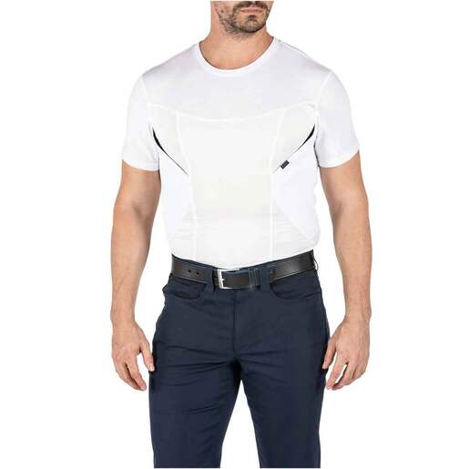5.11 Men's Cams Short-Sleeve Base Layer Shirt - The CAMS next-gen compression short sleeve base layer tee is an outstanding concealed carry alternative to IWB or appendix-carry - perfect to wear beneath a collared shirt or similar garment. Upper body: 60% cotton/40% polyester, jersey, wicking Pocket: 92% polyester/8% elastane spacer mesh, wicking, anti-odor Two side body / underarm pockets for concealment and accessories Jersey upper body with crew neckline 5.11[+] woven label at wearer's left pocket opening Lower body: 86% polyester/14% elastane jersey, wicking, anti-odor Padding: Ortholite 4mm Hook and loop closures Style: 41222ABR