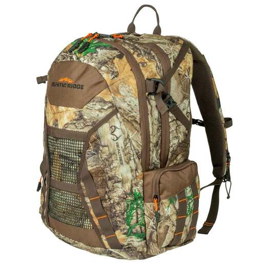 Rustic Ridge 2200 36 Liter Hunting Day Pack - Quiet, durable brushed tricot fabric Padded back and shoulder straps with adjustable sternum strap Large front pocket with interior organization Quick access large side pockets with compression straps Front mesh stuff pocket for additional storage Hydration system compatible