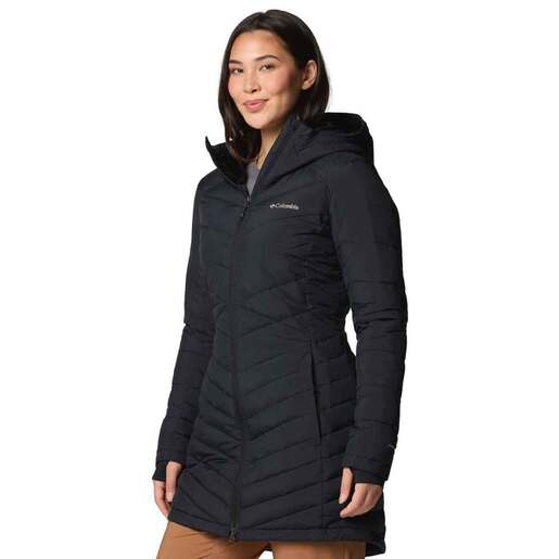 Columbia Women's Joy Peak II Mid Insulated Jacket - Cold? Not in this jacket. Stay warm with our thermal-reflective gold lining that retains body heat, recycled, synthetic insulation, sleek fabric that resists light rain, and the ideal length for extra coverage. Omni-Heat Infinity lining retains body heat while remaining breathable using an expanded pattern of thermal-reflective gold dots Omni-Shield repels moisture and resists stains by preventing liquids from absorbing into fast-drying yarns 100% recycled polyester Thermarator insulation delivers lightweight warmth using down-like fibers that retain loft when wet Plush fleece-lined hood and collar for warmth and style Chin guard prevents chafing Interior security pocket and zippered hand pockets secure small items Mid length with a droptail hem for extra coverage and protection Comfort cuffs with thumbholes seal out the elements Center back length: 34.5in Style: 2088641