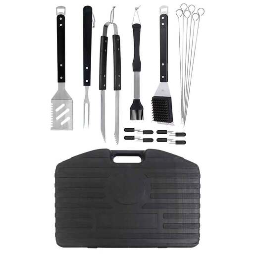 Mr. Bar-B-Q 20 Piece Barbecue Tool Set - Reinventing the meaning of a complete set! Sturdy stainless steel construction with plastic handles. With a durable case for carrying and storing. Set Includes - 4-in-1 Spatula Tongs 6 Skewers Fork Silicone Basting Brush Grill Brush 8 Corn Holders Carrying Case