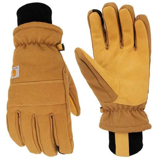Carhartt Women's Insulated Duck/Synthetic Leather Knit Cuff Work Gloves - These women's two-in-one gloves have an outer shell made of sturdy cotton duck with synthetic palm and knuckle protection. Rib knit cuff for comfort and fit Secure elastic at wrist Ultra soft insulation, FastDry technology lining wicks away sweat Durable cotton Duck shell with synthetic leather palm, finger and thumb Style: GL0781