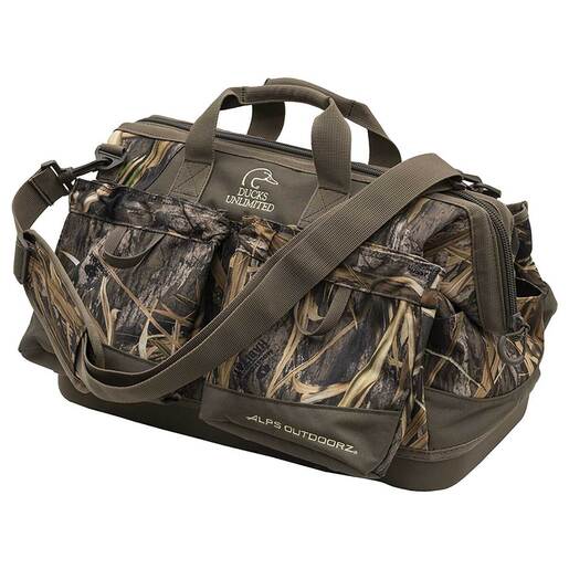 ALPS Outdoorz Ducks Unlimited Pit Blind Bag - The Pit Blind Bag features a large pop-open main compartment with a removable divider to customize the content load. Additional interior pockets keep smaller items separated and within easy reach. Outside, the Pit Blind Bag boasts two hold-open pockets. These are designed to hold different shells organized and quickly accessible when switching between shot loads. An extra-large exterior pocket is also included to provide storage for a thermal beverage container or for use as an additional gear storage option. Two sewn-in carry handles flank the rugged zippered top, while a removable, adjustable and padded shoulder strap offers hands-free carry. Rounding out the key features is a waterproof, molded bottom panel to provide added support and content protection when the bag is sitting on wet ground. Features "Pop-open" main compartment design allows for easy access to gear The main compartment has a removable divider along with other compartments for keeping gear organized Two "hold-open" exterior pockets are great for different shell options Waterproof, molded bottom panel to give the main compartment extra protection when sitting in wet fields Extra-large exterior thermos pocket can also double as extra gear storage Carry handle and removable, over the shoulder, carry strap option