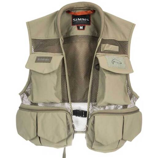 Simms Tributary Fishing Vest - Simms' classic mesh vest keeps it lightweight and breathable while offering the best pockets-to-price value on the water. Durable and weather-resistant nylon shell with breathable polyester mesh for comfortable travels Two large horizontal lower pockets, six flapped hook and loop drop pockets and large zippered game pocket "Third hand" rod holder and net D-ring Padded collar for all day comfort FABRIC TECH: Shell: 100% Nylon; Mesh: 100% Polyester