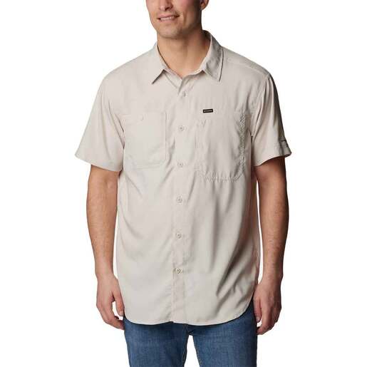 Columbia Men's Silver Ridge Utility Short-Sleeve Shirt - Stay sun-safe and cool with this bestselling hiking shirt. UPF 50 keeps you protected from harmful rays, while breathable, sweat-wicking, odor-neutralizing fabric keeps you feeling fresh and comfortable. Omni-Shade Broad Spectrum UPF 50 protects against skin damage using select fibers and fabrics to block a wider range of UVA/UVB rays, so you stay safer in the sun Omni-Wick keeps you dry and cool by pulling moisture to the fabric’s surface to evaporate, delivering fast-drying, next-to skin comfort in the heat Fabric captures and neutralizes odor for long-lasting freshness Vented in back for breathability Snap-close chest pocket on right side Chest pocket on left side with side entry and hook-and-loop closure Locker loop for hanging Button-up placket with snaps at the top for easy adjusting Crafted with recycled materials Center Back Length: 30in Uses: Hiking