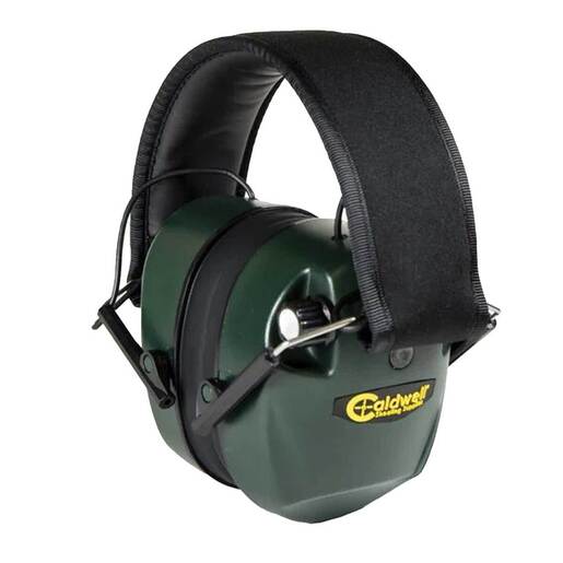 Caldwell E-Max Electronic Earmuffs - The Caldwell E-Max hearing protection combines great circuitry with a standard earcup for better protection. The two microphones in the E-Max amplify sounds below 85 decibels, which amplifies normal communication, range commands, and environmental sounds. Above 85 decibels, the microphones shut off to protect the shooter's hearing. Ear cup width is 1.75 inches and two AAA batteries are required but not included. Enabled with one stereo microphone in each cup, the user can localize sound from all directions. 25dB Noise Reduction Rating. Features: 25dB noise reduction rating, dual microphones. Amplifies sounds below 85 decibels; above 85 decibels, the microphones instantly shut off to protect the shooter's hearing. True stereo amplification delivers maximum volume and clarity. Padded headband for maximum comfort. Compact, collapsible design.