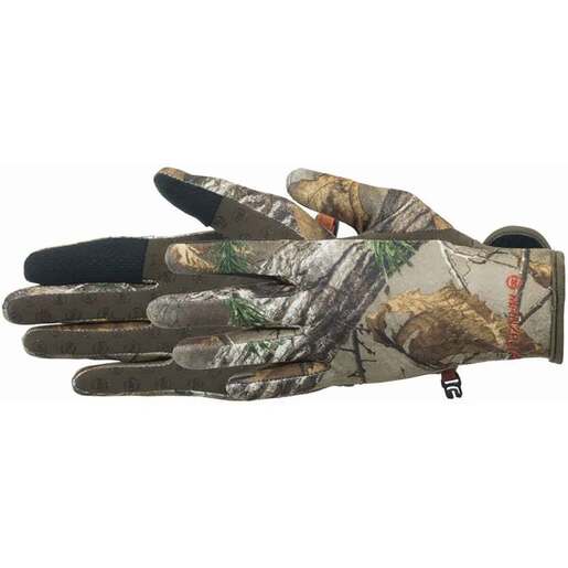 Manzella Bow Ranger Touchtip Men's Hunting Gloves - Realtree Edge - This lightweight hunting glove with TouchTip technology is the perfect hunting companion. With a breathable polyester fleece shell, high grip palm patch, and elastic wrist gather combine to make a functional glove that has the perfect balance of warmth, mobility, comfort, grip and durability. Plus, the thumb/index finger touchscreen compatibility makes it easy to operate your smartphone without exposing your digits to the elements. Lightweight and breathable hunting glove Shell is constructed of 3-ply polyester spandex Palm is reinforced with MIB Control Trax TouchTip on index finger and thumb are touch screen compatible Extra long cuff and advanced grip Care instructions: Hand wash cold, lay flat to dry