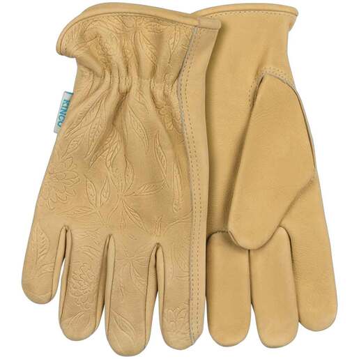 Kinco Women's Hydroflector Water-Resistant Premium Grain Cowhide Driver Work Gloves - With their slim, women’s-specific fit and industry-unique floral deboss patterned back-of-hand, these premium grain cowhide drivers are made for tough gals who tackle tough tasks on the farm, in the garden, or at home. Soft to the touch, they gain flexibility with every use, and even help your hands stay dry in wet conditions thanks to a water-resistant treatment. Debossed floral pattern tan aquaHIDE water-resistant premium full grain cowhide provides excellent protection in wet conditions, good durability from wear & tear, & shields the hand from punctures & abrasions Easy-On cuff with shirred elastic wrist facilitates quick on & off use, while tightening the shell material to the hand for a secure fit & providing an additional preventative measure to block debris from further entering the glove Tan pieced aquaHIDE cowhide hem incorporates an added piece of material, which creates a finished look, holds all layers of the glove together, & prevents fraying Out-seam index finger provides the smooth, comfortable feel of a seamless interior & eliminates rub points that often accompany bunched material typically inside the glove Ergonomic keystone thumb design, which includes an extra sewn-in piece of material, offers flexible, full-range of motion & helps to prevent hand fatigue Gunn cut pattern allows for fewer seams between the fingers, reduces the exposure of seams in high-wear areas of the palm, & allows the back-of hand base material to remain seamless for longer wear & comfort Leather welt at high-contact base of middle & ring fingers reinforces seam strength & durability California Proposition 65 Warning - P65Warnings.ca.gov Style: 398PW