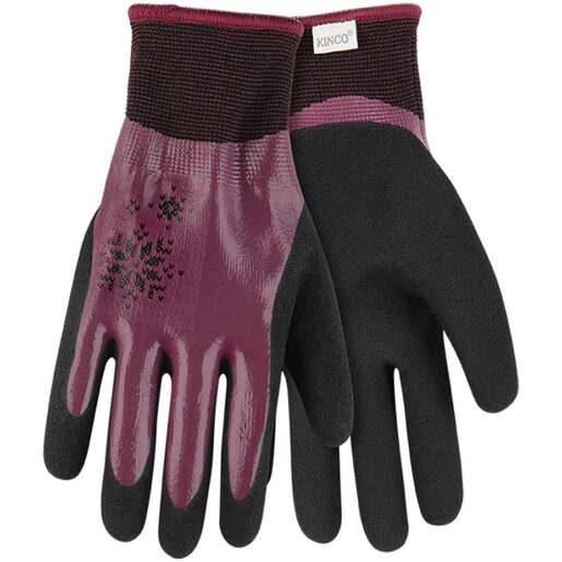 Kinco Women's Hydroflector Lined Waterproof Thermal Knit Shell Work Gloves - Made for messy work on oil and gas rigs, construction sites, fishing docks, and more, these HydroFlector gloves provide comfortable coverage in a slim, women’s-specific fit. Their double-layered, thermal knit shell traps hand heat and delivers excellent puncture protection, while a textured, double-coated nitrile palm gives you a solid grip for handling even the most slippery items. The waterproof design lets you comfortably work through wet weather. Double-layered knit shell using black heavyweight 15-gauge 100% polyester outer shell Soft gray heavy thermal 7-gauge brushed-loop 100% acrylic inner liner locks in warmth, repels the cold, & wicks away moisture with seamless, form-fitting comfort Burgundy full-coverage smooth nitrile waterproof coating, known for its strength & superior puncture & tear resistance, offers excellent dexterity, stands up well to light oils, & maintains flexibility in cold environments Textured black sandy nitrile coated palm provides optimal grip control, & offers dependable puncture & tear resistance Continuous polyester-acrylic blend & elastic knit wrist provides a seamless, snug fit at pulse-point, which helps to retain warmth where heat often escapes the body, & helps to prevent debris from infiltrating the glove Color-coded polyester overlock hem indicates size & helps prevent fraying Seamless design provides dexterity & comfort California Proposition 65 Warning - P65Warnings.ca.gov Style: 1886PW