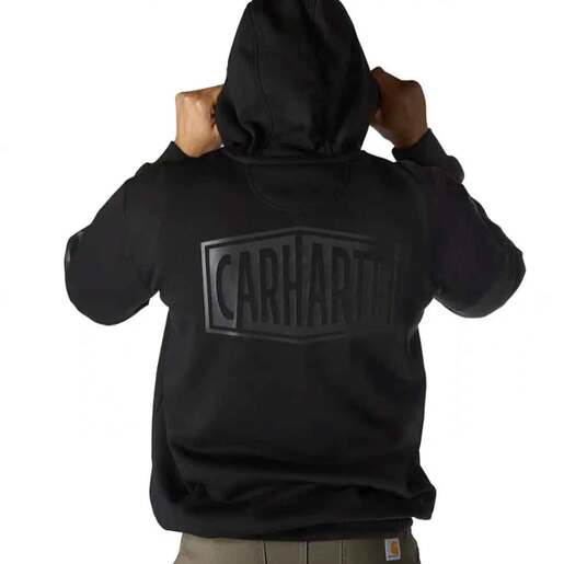Carhartt Men's Rain Defender Loose Fit Heavyweight Logo Work Hoodie - Versatile midweight warmth and familiar cotton-blend fleece comfort. This men's graphic hoodie has the added benefit of Carhartt Rain Defender for resisting damp weather. A loose fit allows for easy layering and unrestricted movement. Rain Defender durable water repellent (DWR) technology forces light Loose fit Attached three-piece hood with drawcord closure Rib-knit storm cuff and hem keep out the cold Front handwarmer pocket with sewn-on Carhartt label Carhartt graphic on back and left sleeve Style: 107030