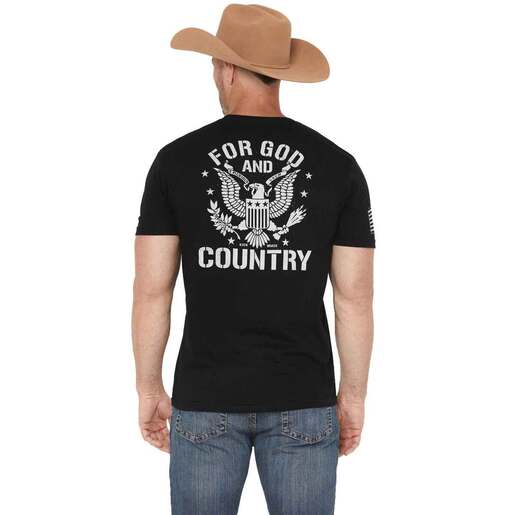 Kick Brass Men's For God and Country Short-Sleeve Casual Shirt - Designed for all day comfort with a large graphic on the back. Model is 6'2in wearing a size large 100% cotton Rib knit crew neck Short sleeves Solid black design Kick Brass logo graphic on left chest American flag graphic on right sleeve Eagle seal graphic on back with "For God and Country" Tagless neck label Style: A3462