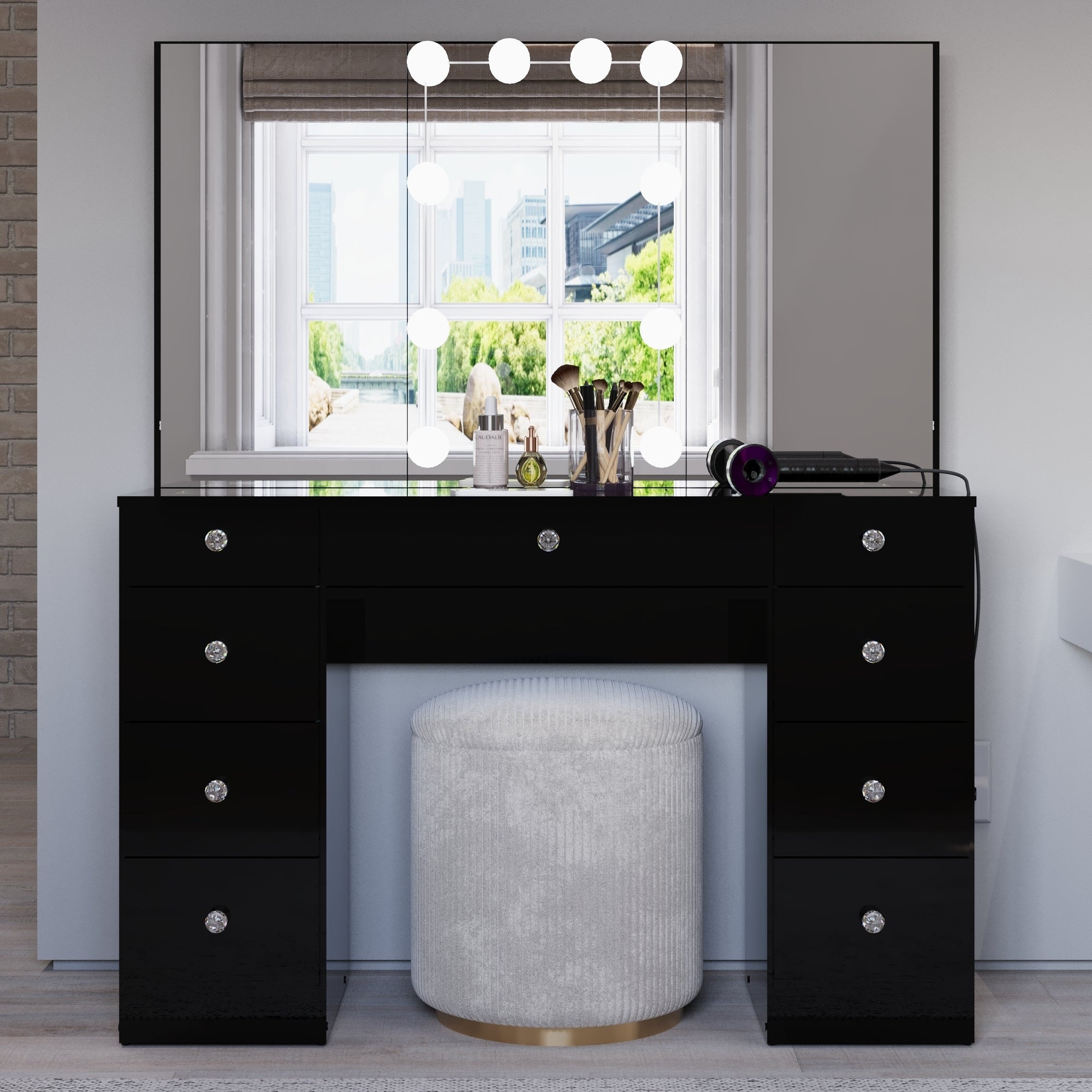 Discover elegance with the Boahaus Lily Makeup Vanity, perfect for beauty enthusiasts. Its stunning glam glass top and 9 drawers with crystal knobs offer both style and ample storage.