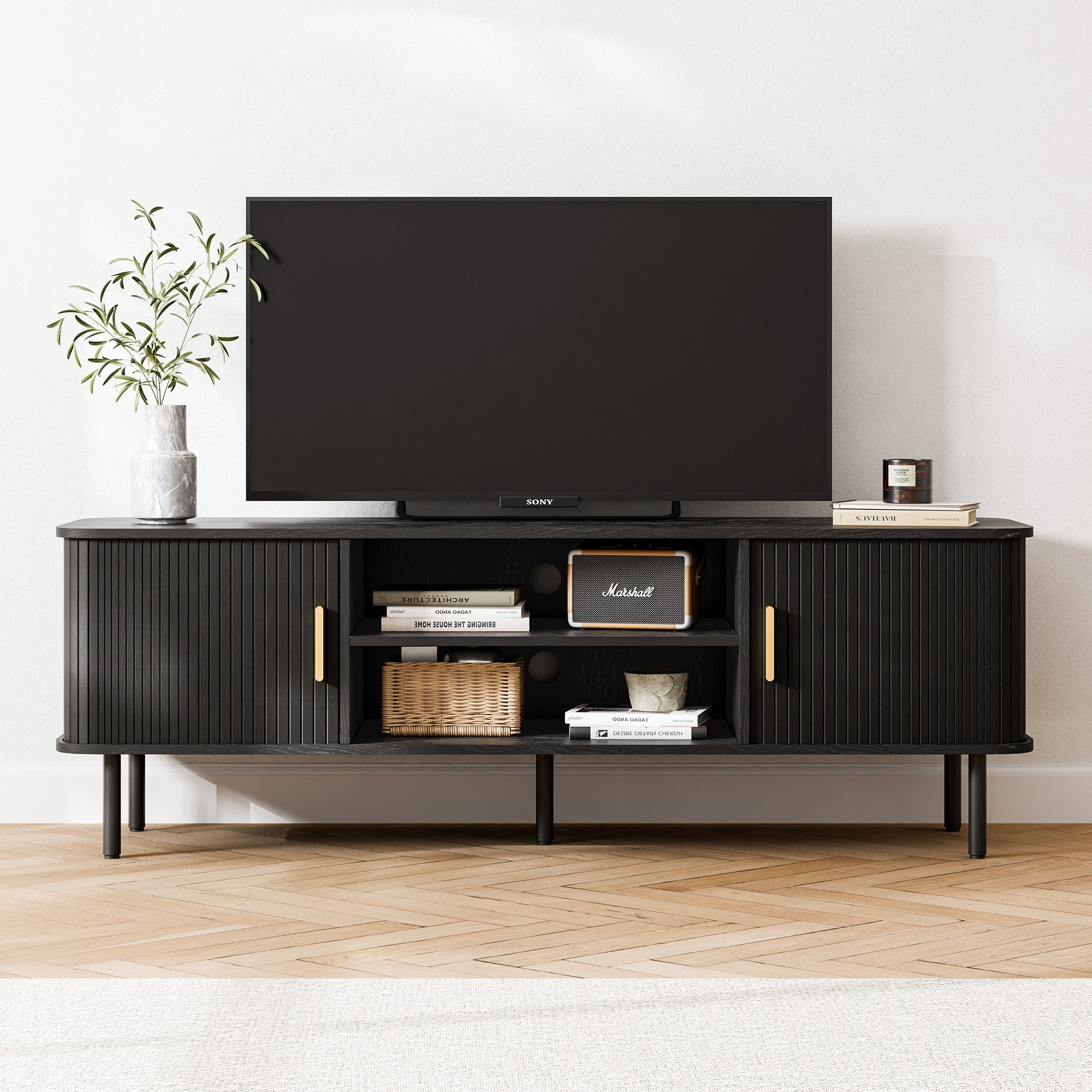 This modern tambour TV stand seamlessly blends striking aesthetics with exceptional functionality, elevating your living room into a stylish and organized spot.